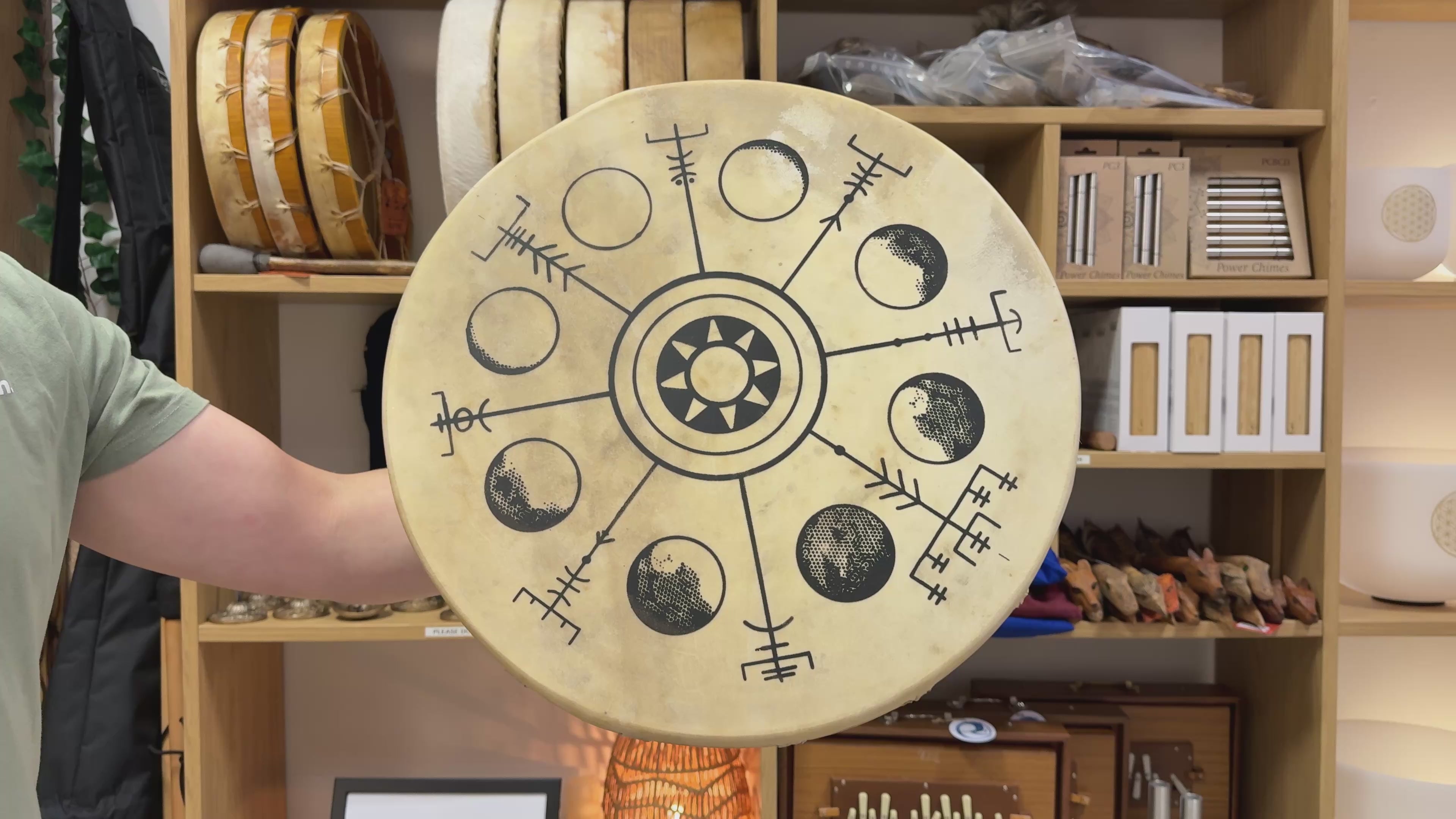 This 50 cm shaman drum is handcrafted with natural goatskin and a solid wooden frame. Its surface bears a screen-printed Vegvísir symbol, surrounded by the phases of the moon and a central sun. The Vegvísir, an ancient Icelandic stave, is a symbol of guidance and protection, while the lunar imagery connects the player to natural cycles and inner rhythms.